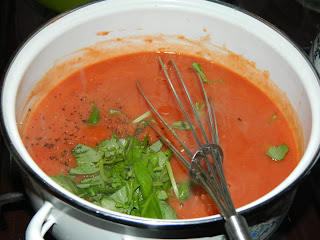 A mártáshoz egy kevés oalajt hevítek, beleteszek 2 evőkanál lisztet, lepirítom, felöntöm a megmaradt langyos levessel és habverővel krémesre kavarom. Jöhet bele 1 pohárparadicsomlé, ételízesítő, bors és apróra vágott bazsalikom, meg a főtt hús, apróra darabolva. Közben a krumpli is megfőtt, elkészülhet a püré. És már tálalhatunk is.